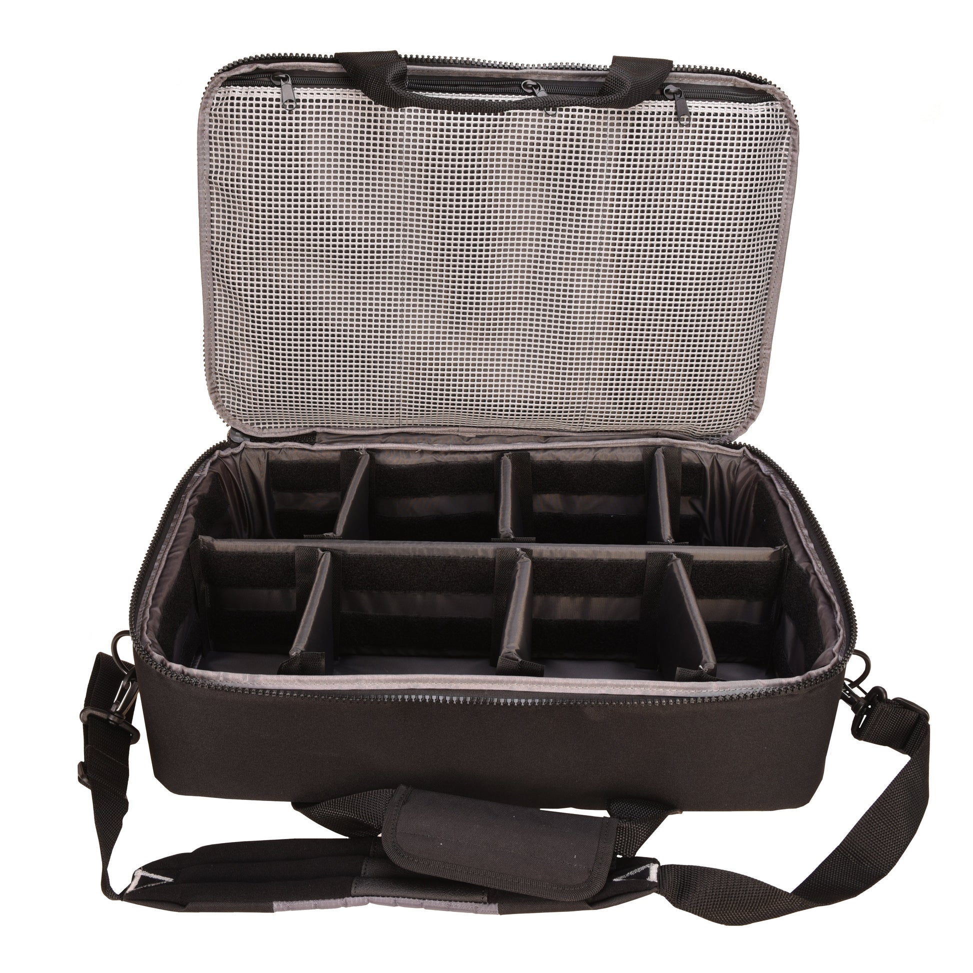 The GPS: Wild About Fishing Large Reel Case features 8 adjustable compartments for organized fishing reel storage. The compartment dividers are made with stiffeners and a PE board main divider down the center. The adjustable dividers feature a duck foot hook and loop system that allows you to adjust the storage space available to each reel. The Large Reel Case is equipped with an adjustable shoulder strap for convenient transport on your fishing excursions. This case also has 3 zippered leader pockets so you can store your leaders efficiently. This case’s exterior is a pebble non-slip, water resistant material shell with oversized heavy duty dive zippers. The Large Reel Case is designed to keep your collection of reels organized and protected from harsh weather conditions.