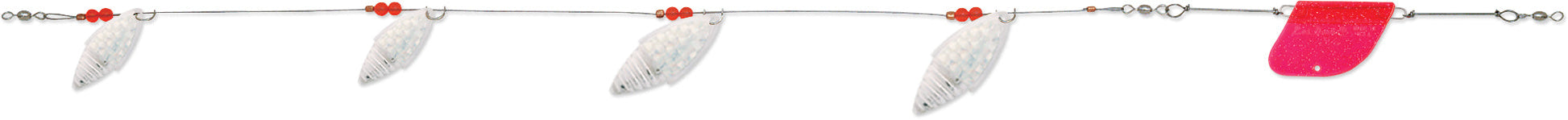Offering a unique blade design that is half smooth and half rippled, the School-O-Minnows troll offers a pulse and vibration unmatched by trolls featuring similarly sized blades. Easy-pulling design features high strength flexible cable rigging and an integrated trolling rudder. See Tech Report #5: Lake Trolling Trout Techniques.