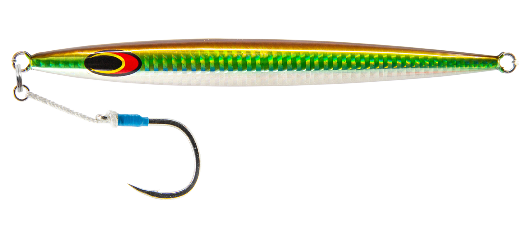 The STREAKER JIG was designed for deeper water and to sink quickly and get worked at a medium to fast retrieve speed. The erratic action triggers a reaction bite from predators, and the long slender design, with a slightly flat back allows for excellent hook-up rates on all species.
